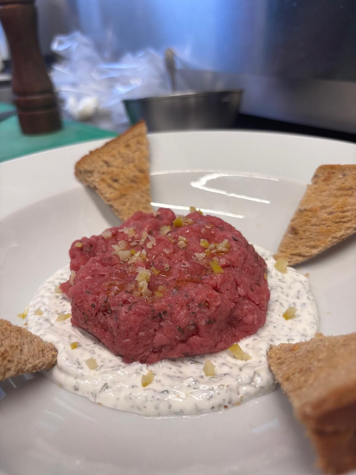 Tartare di manzo, condita co olio EVO, pepe nero, limone fermentato e menta, adagiata su un letto di yogurt greco. Una visione essenziale del crudo: profumata, leggera e sorprendente!