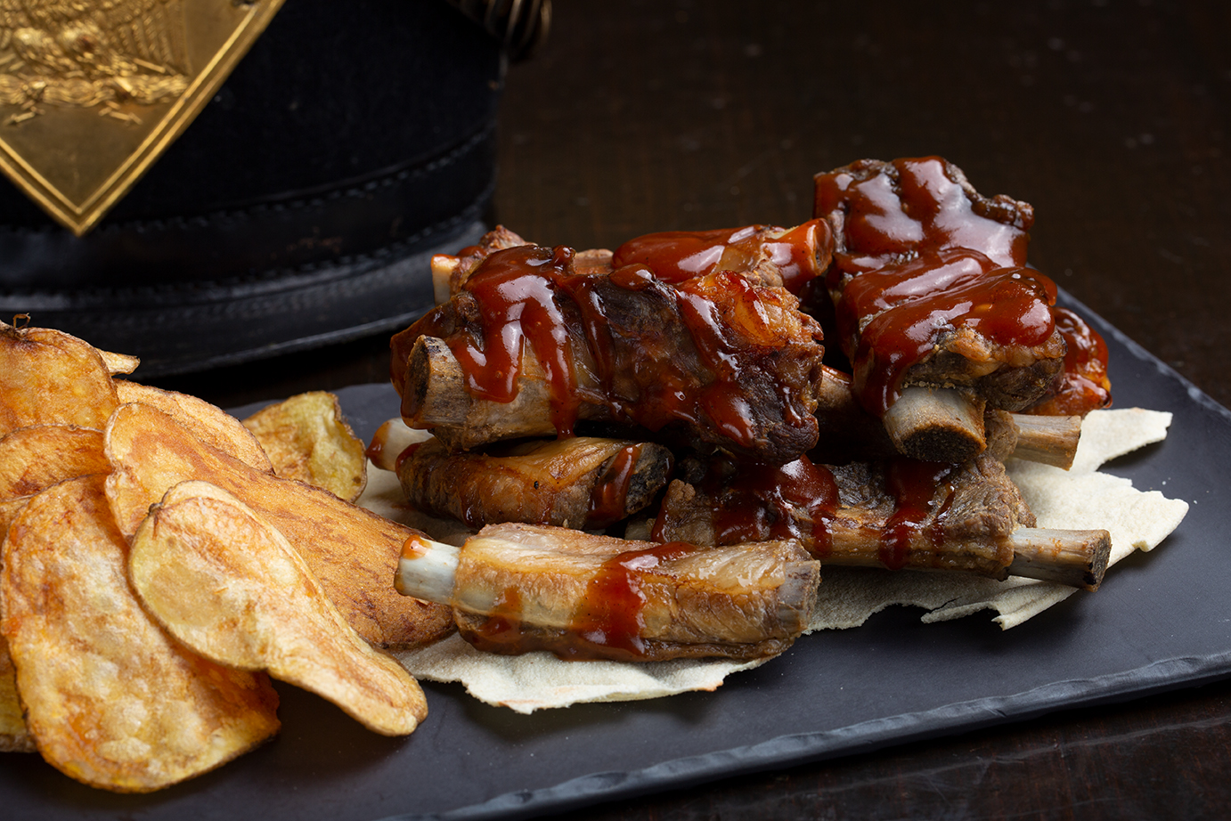 Costine di suino italiano, taglio St. Louis, marinate a secco, cotte in CBT per 24h, glassate con salsa BBQ e finite sulla griglia. Servite con mashed potatoes