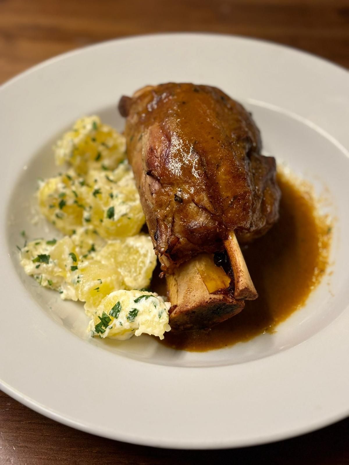 Stinco di maiale al forno, marinato nella birra e speziato, abbinato alla sua salsa e servito con mashed potatoes