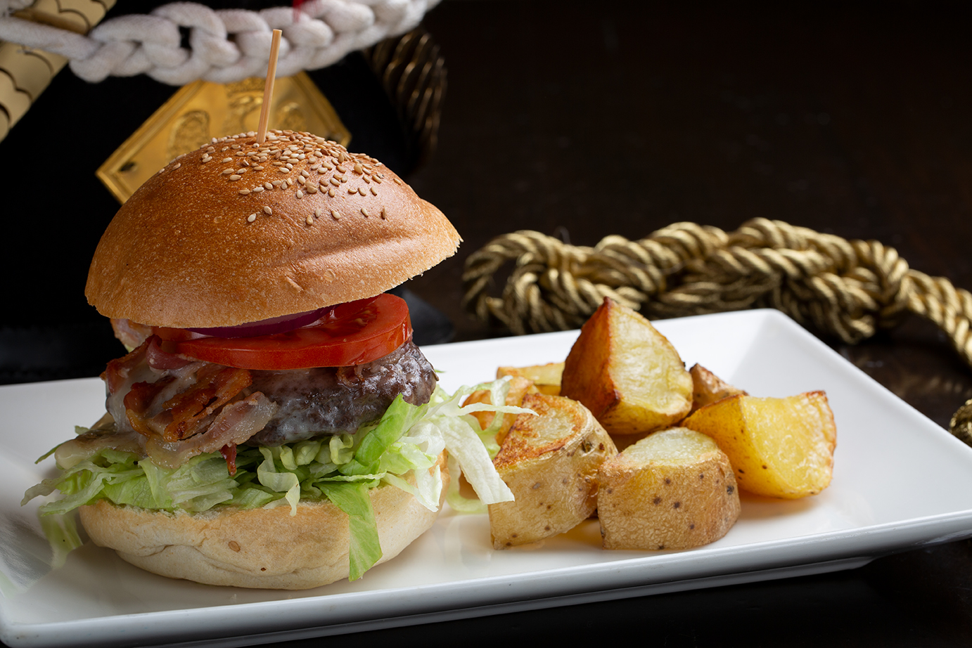 Burger di razza simmental bavarese del Vecchio Piero, gorgonzola, bacon, cipolla caramellata, pomodoro e insalata, servito con patate al forno