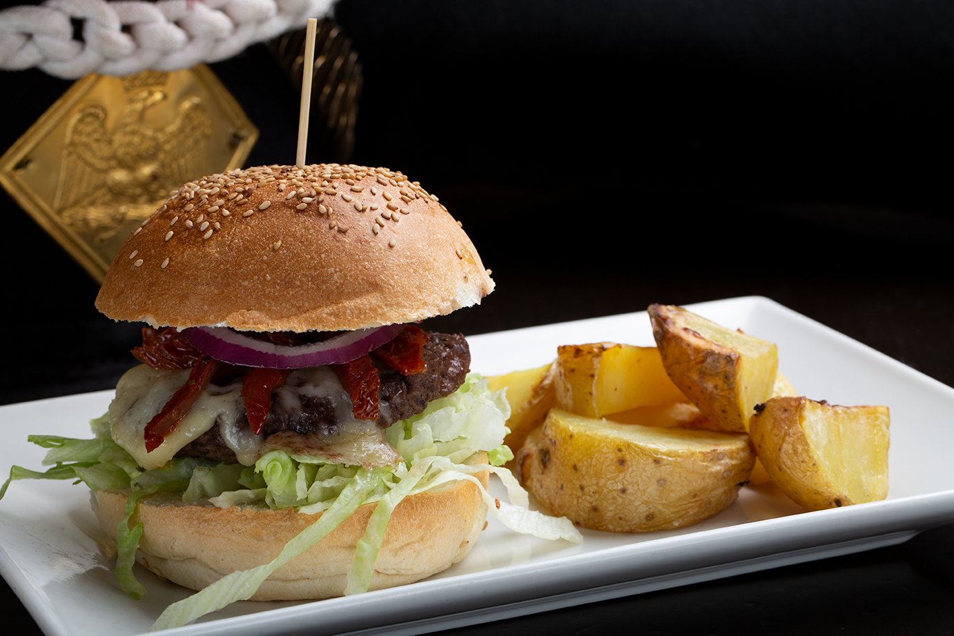 Hamburger di razza simmental bavarese, grana padano, pomodori secchi, insalata, cipolla caramellata, servito con patate al forno